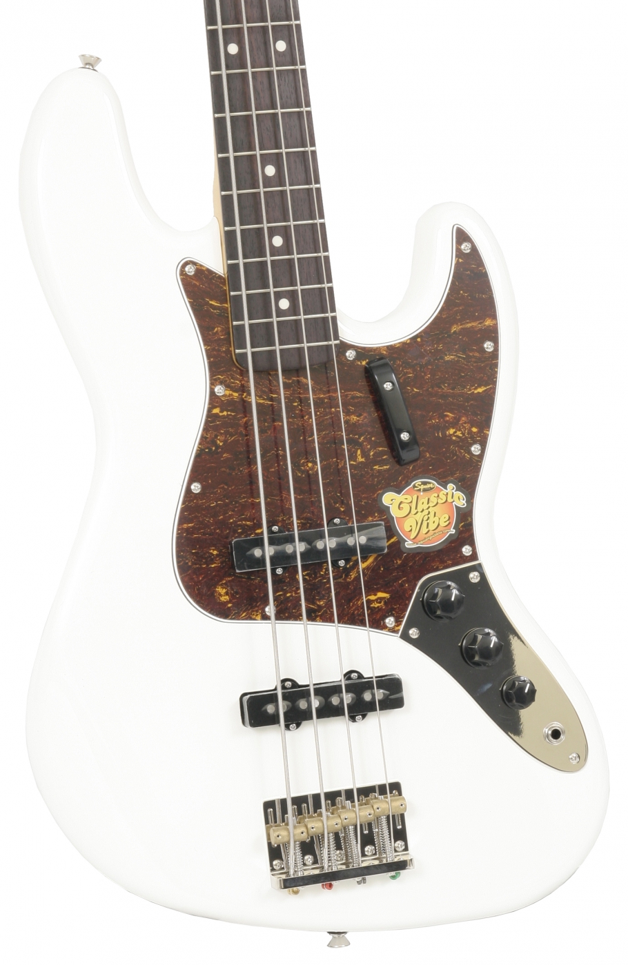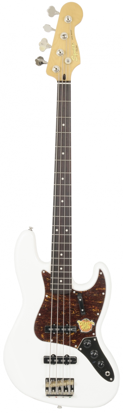 Squier's Classic Vibe Jazz Bass '60s has all of the "deluxe" elements its Fender big brother had when it was introduced in the 1960s--a groovy offset waist, a narrow fast-action maple neck with a rosewood Fingerboard, two custom single-coil pickups, individual volume controls that let players "solo" either pickup or blend them, and a master tone control for overall sound shaping. The look is pure Fender--a classic Olympic White finish on a basswood body with a tortoise shell pickguard, thumb rest and HiMass bridge with brass barrel saddles. The vintage-tint gloss-maple neck has a rosewood Fingerboard with 20 vintage-style frets and a modern 9.5" radius. Tonal versatility and clarity with a quick, punchy up-front sound.