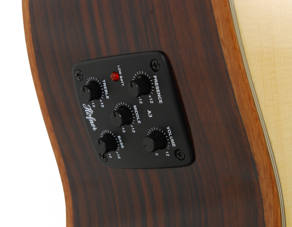Handmade in Germany Hofner HA-GA07 is a solid acoustic guitar from The Grand Auditorium series which falls between the Grand Concert and the Jumbo, both in terms of sound and body-size. HA GA 07 is equipped with Höfner pre-amp system with four band EQ and tuner. Hofner HA GA07 is one of the most popular models that comes in rosewood back and sides, and spruce, high gloss top.