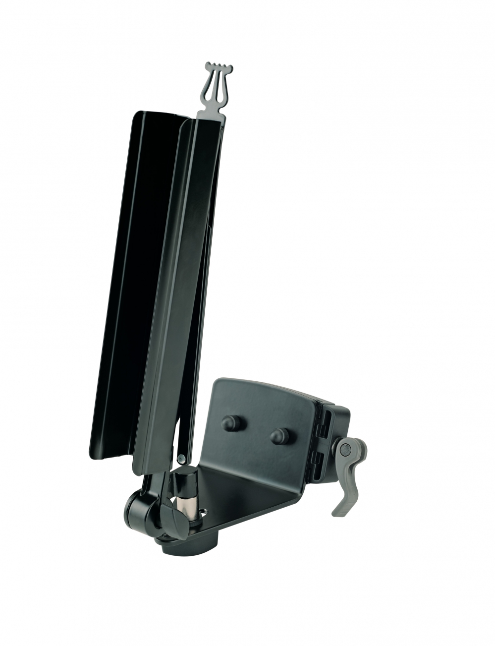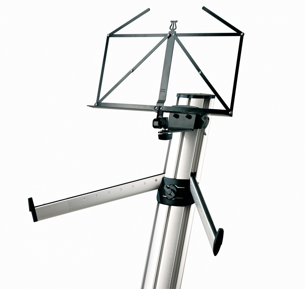 The exclusive sheet music holder for the Spider Pro models 18860 and 18840 is easy and convenient to attach to the column of the keyboard stand. The stable stand can be freely height adjusted by means of the ergonomic clamping lever. The angle of inclination is safely fixed in a stable position with the toothed hinge. The sheet music holder can be positioned at any distance or direction using the clamping screw. Like a standard sheet music stand, the holder is simply folded for transport.