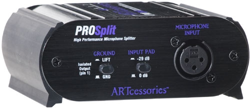 The ProSplit includes a ground-lift switch on the isolated output to reduce noise due to ground loops between connected equipment. For versatility the ProSplit also features an attenuator pad switch on the input that can be used to alternately connect a preamplified (line-level) signal to the two microphone-level ProSplit outputs.