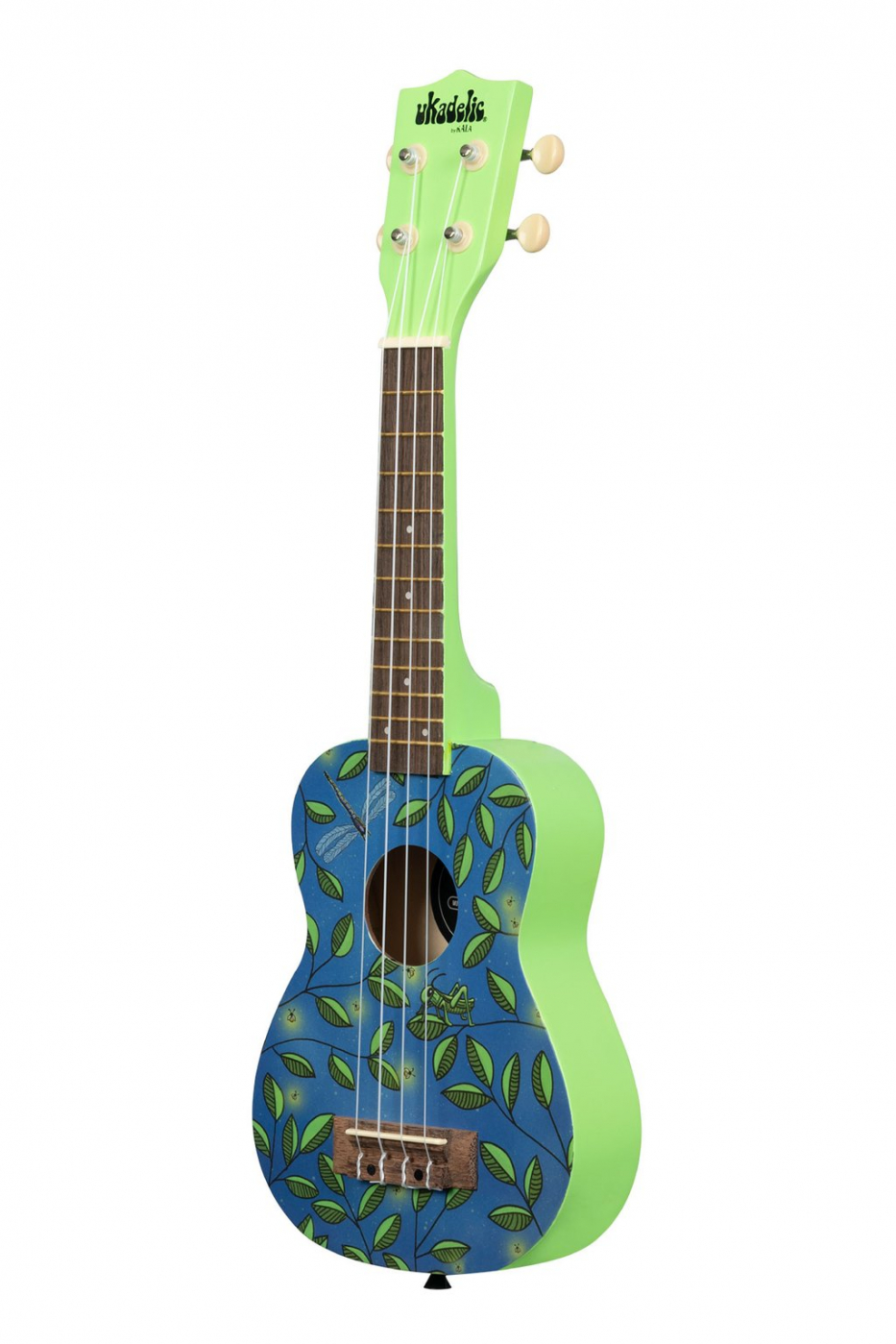 On a hot summer night fireflies come out to play, lighting up the sky providing the theme for Night Light Ukadelic. Not to be outdone on this summer evening, a cricket sits on a leaf and offers up his own distinct song, while a dragonfly makes its way to the water. This original artwork was created in house artists and is complemented by Grasshopper green back and sides.